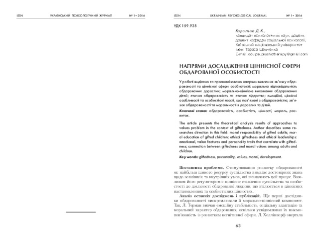 - Корольов, Д.К. (2016) Research Approaches to Gifted Personality Values Ukrainian Psychological Journal, 1. pp. 63-75.