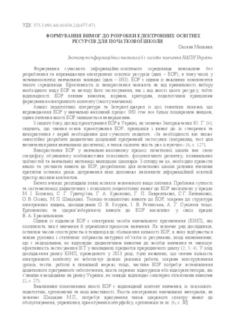 - Мельник, Оксана Миколаївна (2014) A formation of the requirements for development of electronic educational resources for primary school In: ІІ Всеукраїнська науково-практична конференція "Наукова молодь-2014" . Інститут інформаційних технологій і засобів навчання НАПН України, м. Київ, Україна.