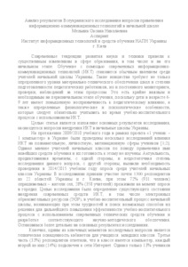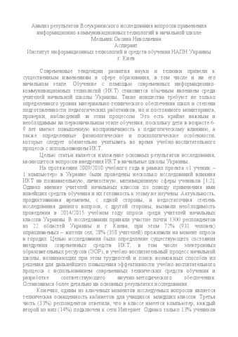 - Мельник, Оксана Миколаївна (2015) Analysis of the results of a nationwide study on the use of ICT in primary school Педагогический поиск, 4 (27). pp. 95-99.