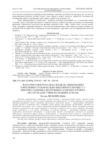 - Мельник, Оксана Миколаївна (2015) The factor-criteria model of assessment of efficiency of educational process with electronic educational resources for primary school students Наукові записки. – Серія : Проблеми методики фіз.-мат. і технол. освіти, 9 (3). pp. 195-201.