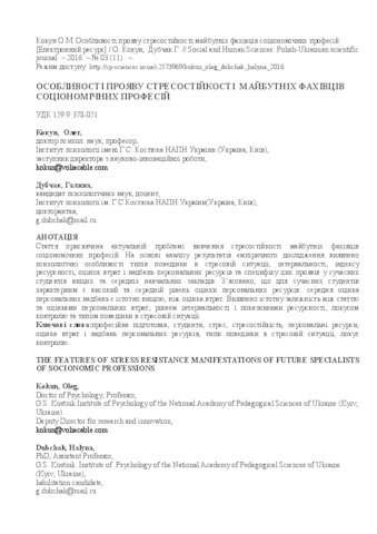 - Кокун, Олег Матвійович and Дубчак, Галина Михайлівна (2016) The features of stress resistance manifestations of future specialists of socionomic professions Social and Human Sciences. Polish-Ukrainian scientific journal, 3 (11). ISSN 2391-4165