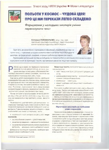- Пономарьова, К. І. (2017) The formation in pupils the ability to retell the text Учитель початкової школи, 3 (46). pp. 11-15.