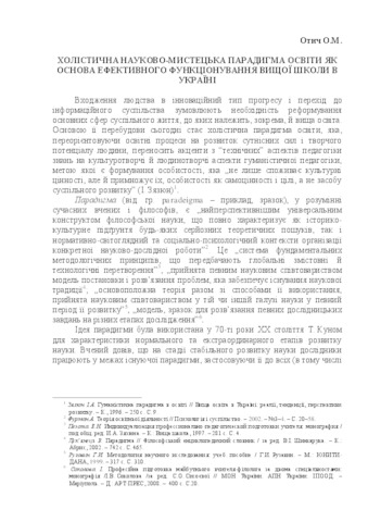 Entry humanity in an innovative type of progress and transition to an information society necessitate reform of the main areas of public life, which include, in particular, higher education. The basis of the restructuring is becoming Holistic Paradigm Education, which pereoriyentovuyuchy educational processes in the development of essential powers and creativity of man, brings focus to the "technical" aspects of pedagogy knowledge on culture-and lyudynotvorchi aspects of humanist pedagogy, the purpose of which is the formation of personality, "not only consuming cultural values, but also multiplies them as individual self-worth and purpose, not as a means of social development ".