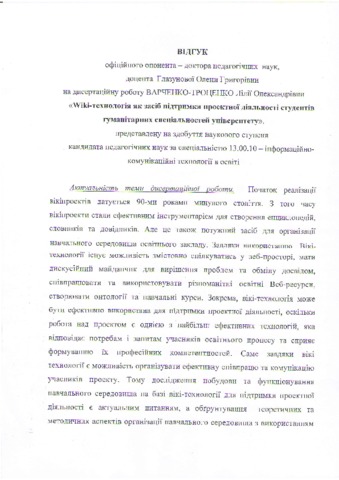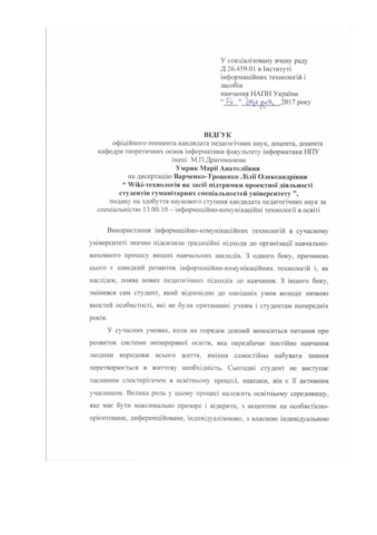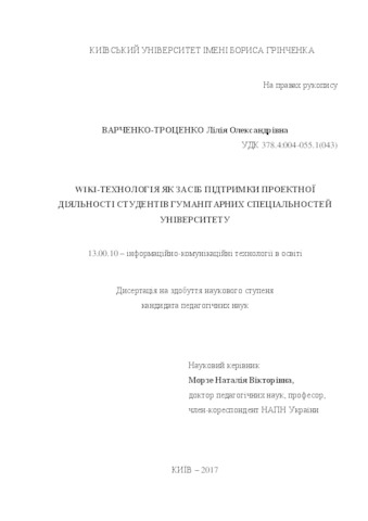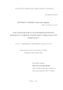 - Варченко-Троценко, Л.О. (2017) Wiki-technology as a means to support the project activity of students of humanitarian specialties of university Dissertation candidate thesis, Київський університет імені Бориса Грінченка.