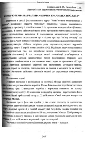 - Теплицький, І.О. and Семеріков, С.О. (2003) Computer training physical game "Soft landing" Наукові записки: збірник наукових статей Національного педагогічного університету імені М.П. Драгоманова (53). pp. 347-355. ISSN 2310-371X