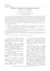 Topicality of the material, highlighted in this article is stipulated by the need to ensure effectiveness of educational process while preparing mining engineers. System of competencies for future mining engineers, taken as basis for high school sectoral standard for Mining 6.050301 update is theoretically substantiated and developed. Sources of state-of-the-art foreign educational system and technologies as well as scientific research results of local teachers have been analyzed, enabling development of new sectoral standard. Switching to new high school competencies-based sectoral standards is the necessary step in high education reforming in Ukraine, while the application of competencies-based approach to high school sectoral standards development facilitates tuning of education towards labour market’s requirements and demands, further development of educational techniques and educational system as a whole. Objective of the article: to project system of competencies and to define components of environmental competencies for mining engineers. Methods: – theoretical: analysis, generalization, systematization of legislative framework, educational standards, Internet - sources in order to distinguish theoretical basis of research, develop system of competencies for future mining engineers. – Empirical – improvement of system of competencies for future mining engineers. Scientific novelty is represented with structured system, consisting of 49 competencies, comprising the core of new sectoral standard for mining engineers preparation; Practical importance of the outcomes is related to developments: separate constituents of high school draft sectoral standard for Mining engineers bachelors’ preparation 6.050301 Mining (system of social & personal, general scientific, tool-based, general professional and special professional competencies. Research outcomes can be used while developing educational qualification profile and training program for Mining bachelors 6.050301 education field, in course of geoinformational technologies review by ecology, land survey and geography bachelors.