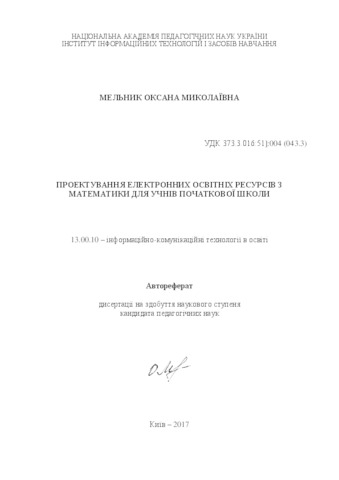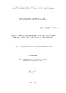 - Мельник, Оксана Миколаївна (2017) The Designing of the Electronic Educational Resources in Mathematics for Primary School Students Dissertation candidate2 thesis, Інститут інформаційних технологій і засобів навчання.