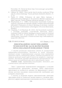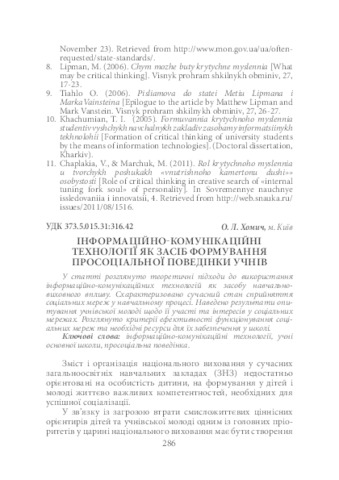 - Хомич, О. Л. (2016) Information and Communication Technologies as a Means of Formation of Prosocial Behavior of Pupils Теоретико-методичні проблеми виховання дітей та учнівської молоді, 2 (20). pp. 286-296. ISSN 2308-3778