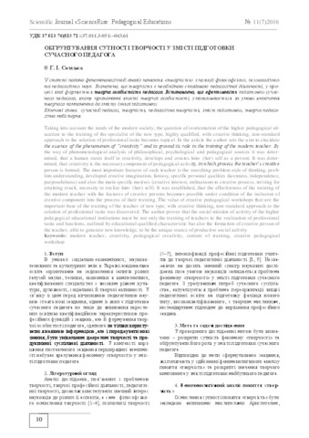 Taking into account the needs of the modern society, the question of reorientation of the higher pedagogical ed-ucation to the training of the specialist of the new type, highly qualified, with creative thinking, non-standard approach to the solution of professional tasks becomes topical. In the article the author sets the aim to elucidate the essence of the phenomenon of “creativity” and to ground its role in the training of the modern teacher. By the way of phenomenological analysis of philosophical, psychological and pedagogical sources it was deter-mined, that a human states itself in creativity, develops and creates him- (her) self as a person. It was deter-mined, that creativity is the necessary component of pedagogical activity, in which process the teacher’s creative person is formed. The most important features of such teacher is the searching-problem style of thinking, prob-lem understanding, developed creative imagination, fantasy, specific personal qualities (keenness, independence, purposefulness) and also the main specific motives (creative interest, enthusiasm to creative process, striving for attaining result, necessity to realize him- (her) self). It was established, that the effectiveness of the training of the modern teacher with the features of creative persons becomes possible under condition of the inclusion of creative component into the process of their training. The value of creative pedagogical workshops that are the important base of the training of the teacher of new type, with creative thinking, non-standard approach to the solution of professional tasks was discovered. The author proves that the social mission of activity of the higher pedagogical educational institutions must be not only the training of teachers to the realization of professional tasks and functions, outlined by educational-qualified characteristic but also the formation of creative person of the teacher, able to generate new knowledge, to be the unique source of productive social activity.