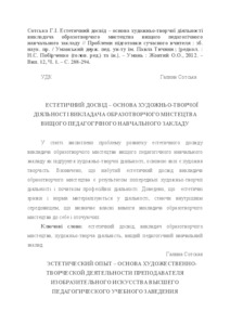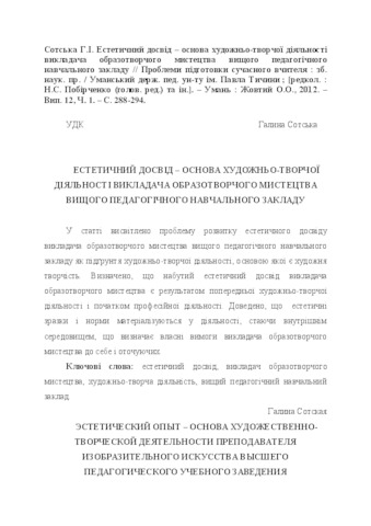 - Сотська, Г.І. (2012) Аesthetic experience - basis of creative art-art teacher senior teacher training institutions Проблеми підготовки сучасного вчителя, 1 (12). pp. 288-294.