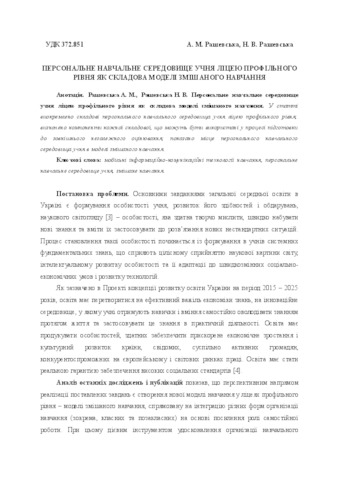 - Рашевська, А.М. and Рашевська, Н. В. (2016) Personal learning environment of the lyceum student profile level as a part of blended learning models Вісник Черкаського університету, 7. pp. 16-23. ISSN 2076-586X