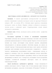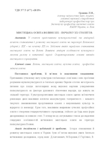 - Єршова, Людмила Михайлівна (2016) Volyn art education ХІХ – early ХХ century Мистецька освіта: зміст, технології, менеджмент, 1 (11). pp. 82-95. ISSN 2410-4434