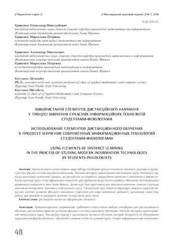 - Кривонос, О.М. (orcid.org/0000-0002-4211-6541) and Кривонос, М.П. (orcid.org/0000-0001-7563-2692) (2016) Using elements of distance learning in the process of studing modern information technologies by students-philologists Міжнародний науковий журнал, 7. pp. 48-55.