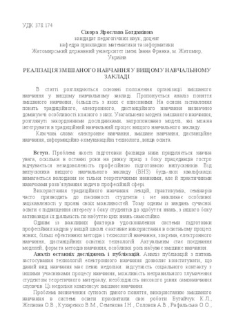- Сікора, Я.Б. (2016) Implementation of blended learning in higher education institutions Науковий вісник Ужгородського університету. Серія: «Педагогіка. Соціальна робота», 2 (39). pp. 236-239. ISSN 2524-0609