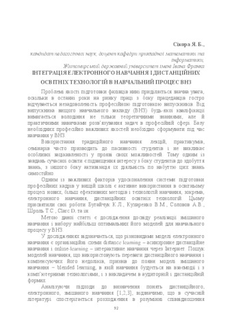 - Сікора, Я.Б. (2016) The integration of e-learning and distance education technologies in educational process of high school In: Актуальні питання сучасної інформатики: Тези доповідей Всеукраїнської науково-практичної конференції з міжнародною участю «Сучасні інформаційні технології в освіті та науці» (10-11 листопада 2016 р.) , 3 . Вид-во ЖДУ ім. І. Франка, м. Житомир, Україна, pp. 92-95.