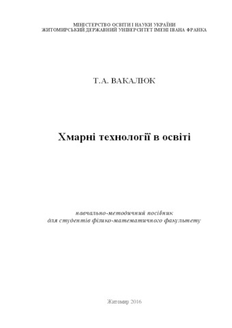 - Вакалюк, Тетяна Анатоліївна (orcid.org/0000-0001-6825-4697) (2016) Cloud technology in education: Textbook for students of Physics and Mathematics [Teaching Resource]