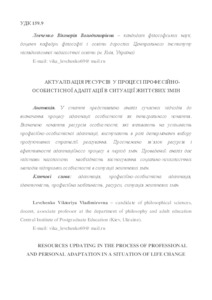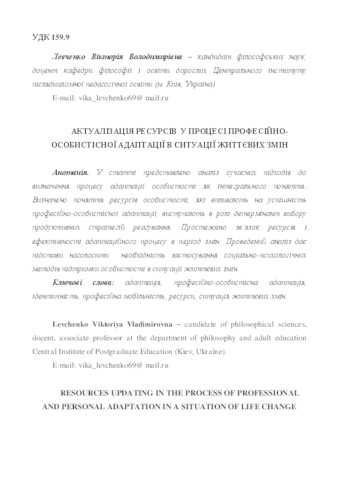 - Левченко, В.В. (2016) Resources updating in the process of professional and personal adaptation in a situation of life change Освіта дорослих: теорія, досвід, перспективи, 1 (12). pp. 50-55. ISSN 2308-6386