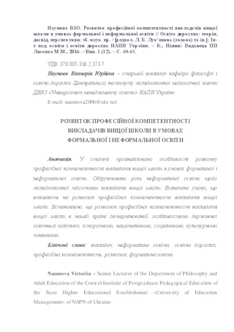 - Наумова, Вікторія Юріївна (2016) Professional competence development of higher education teachers in the conditions of formal and non-formal education Освіта дорослих: теорія, досвід, перспективи, 1 (12). pp. 40-45. ISSN 2308-6386