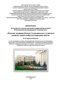 - Василенко, Надія Володимирівна, Войтко, Валентина Володимирівна, Жосан, Олександр Едуардович, Наумова, Вікторія Юріївна, Ніколенко, Л.Т. and Юрчук, Людмила Миколаївна (2016) The program of all-Ukrainian scientific-methodical conference, devoted to the 98th anniversary of the birth of V. Sukhomlinsky "The Scientific legacy of Vasily Sukhomlinsky in the context of education development of personality throughout life" Ексклюзив-систем, м.Кропивницький, Україна.