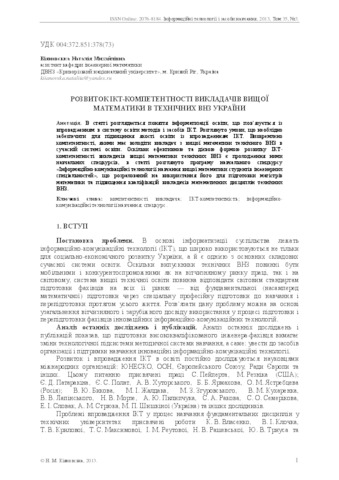 - Кіяновська, Н.М. (2013) ICT-competence development of higher mathematics teachers’ at the technical universities in Ukraine Information technologies and learning tools, 3 (35). pp. 1-10. ISSN 2076-8184