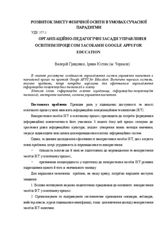 - Гриценко, Валерій Григорович and Юстик, Ірина Вадимівна (2015) Organizational-pedagogical principles of management educational process by Google APPS for Education tools Наукові записки, 8 (1). pp. 1-222. ISSN 978-966-7406-67-7