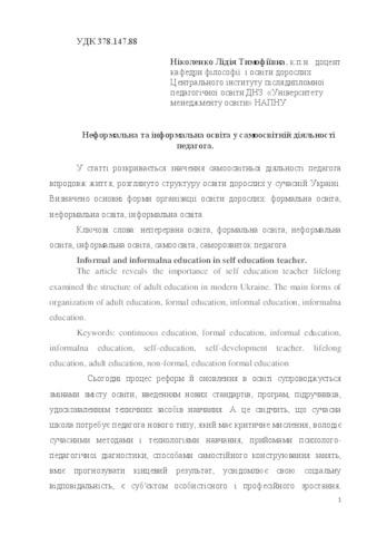 - Ніколенко, Л.Т. (2016) Informal and informalna education in self education teacher Інформаційний збірник для директора та завідуючого дитячим садочком, 6 (18). pp. 68-132.