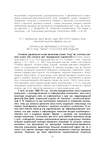 - Найдьонов, Олександр Григорович (2017) Ukrainian network society: its code, the "language" of human relations In: "Дні науки філософського факультету – 2017", Міжн. наук. конф. (2017 ; Київ). Міжнародна наукова конференція "Дні науки філософського факультету – 2017", 25-26 квіт. 2017 р , 3 . Видавничо-поліграфічний центр "Київський університет", м. Київ, Україна, pp. 73-75.