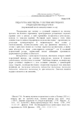 Refers to the history and theory of education in the arts. The authors are leading Ukrainian scientists Rudnytska OP Otych OM Mickle OV, Orlov V., G. Padalka, Nikolai GY, TankoT.P., Rostov O.YA ., Myropolska NE, representing the results of their research, covering the main content of the history and theory of art pedagogy in the context of art education as one of the branches of pedagogy.