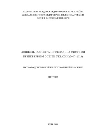 - Preschool education as a component a system of continuous education of Ukraine (2007-2014) : scientific and auxiliary bibliographical index. Release 2. (deposited 27 Apr 2017 15:44) [Currently Displayed]