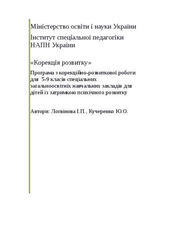 - Логвінова, Ірина Петрівна and Кучеренко, Юлія Олегівна (2016) "Correction of development." The program of correctional and developmental work for 5-9 grade special secondary schools for children with mental retardation [Teaching Resource]