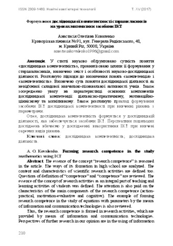 - Коваленко, А.О. (2017) Forming research competence in the study mathematics using ICT New computer technology (15). pp. 210-214. ISSN 2309-1460