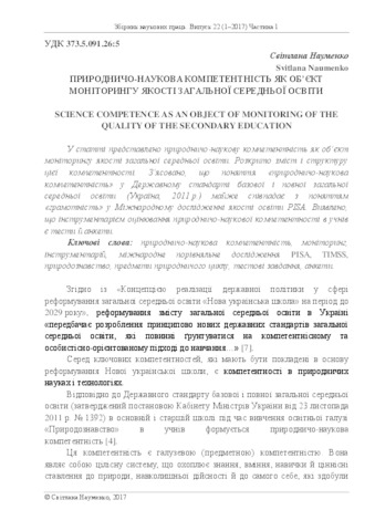 The article presents the science competence as an object of monitoring of the quality of the secondary education. The content and structure of competence are disclosed. It was found out that the term "natural-scientific competence" of the State Standard of basic and complete secondary education (Ukraine, 2011) almost coincides with the term "literacy" in an International study of educational quality PISA. It was discovered that the evaluation tools of natural science competencies of pupils are tests and questionnaires.