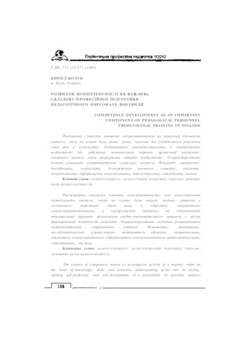 - Котун, К.В. (2012) Competence development as an important component of pedagogical personnel professional training in Finland Comparative Professional Pedagogy, 1. pp. 116-123. ISSN 2308-4081