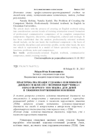 - Рібцун, Юлія Валентинівна (orcid.org/0000-0002-2672-3704) (2015) Feasibility art-speech activity by creating fine art textbooks for children with severe speech disorders Актуальні питання освіти і науки [матер. ІІ Міжн. наук.-практ. конф.] (10−11 лист. 2015 р., м. Харків). pp. 193-198.
