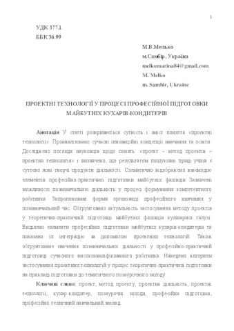 - Мелько, Марина Володимирівна (2016) Project technologies in the process of professional training. future pastry chefs Сучасні інформаційні технології та інноваційні методики навчання у підготовці фахівців: методологія, теорія, досвід, проблеми, 45. pp. 73-77. ISSN 2412-1142