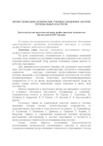 | Keywords: | Cluster, integration, regional cluster, vocational education institution. |