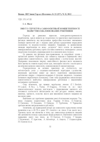 - Мося, І.А. (2012) The Content and Structure of the Self-educational Competence of Future Skilled Workers Вісник ЛНУ імені Тараса Шевченка. - Ч. ІІ, 22 (257). pp. 50-58.