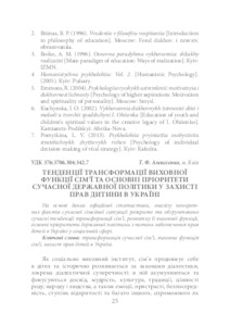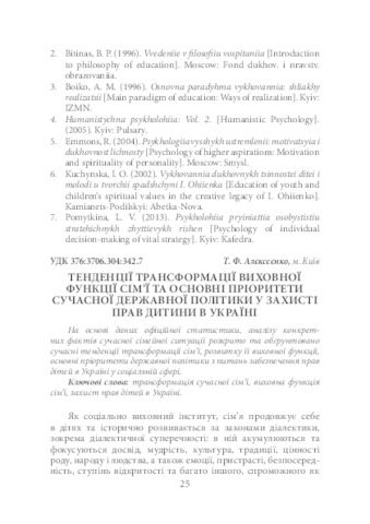 - Алєксєєнко, Т.Ф. (orcid.org/0000-0002-2060-2354) (2016) Trends of Transformation of Family’s Educational Fanction and Priorities of Modern State Policy in Protecting Children’s Rights in Ukraine Теоретико-методичні проблеми виховання дітей та учнівської молоді, 20 (1). pp. 25-35. ISSN 2308-3778