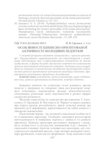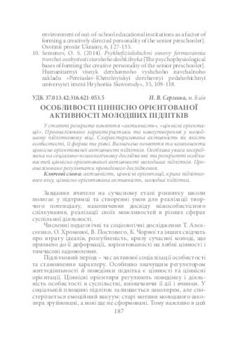- Сергєєва, Н.В. (2016) Peculiarities of Value-Oriented Activity of Younger Teenagers Теоретико-методичні проблеми виховання дітей та учнівської молоді, 20 (2). pp. 187-197. ISSN 2308-3778