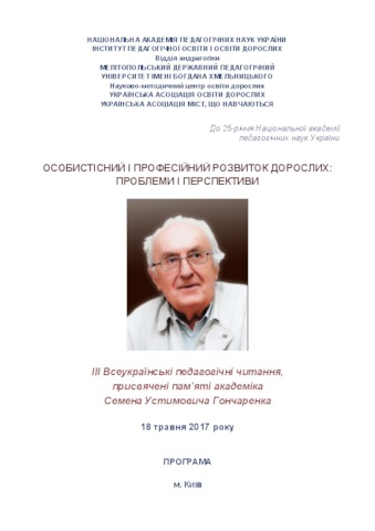 Personal and professional growth of adults: problems and prospects: Program III All-Ukrainian pedagogical readings dedicated to the memory of Academician Semen Ustinovich Goncharenko (Kiev, May 18, 2017)