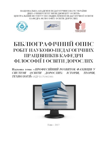 Analytical bibliographic description of the publication of teaching staff of the department of philosophy and adult education TSIPPO SHEE "University Education Management" of the research topic "Professional development of specialists in the system of adult education: history, theory, technology," concluded according to the needs of international exchange of bibliographic information and automation of information and bibliographic processes. The main task of bibliographic description: strengthening information and networking of various business units, departments TSIPPO, universities, OIPPO, teaching services at all levels to carry out scientific and pedagogical, organizational, methodological, information and communication support professional development of research and teaching, teaching staff in educational models courses and mizhkursovoho period as a single andragogical cycle; popularization of scientific ideas, marketing knowledge and educational services; organization of scientific and methodological polylogue between all actors and more. The proposed bibliographic description performs functions such as identification, search, information, organizational, accounting and registration, etc., and meets the requirements vzayemopovyazanym accuracy, completeness, unity, clarity, scientific. Bibliographic description consists of two sections: the first section-electronic bibliography (on-laynhrafiyu) that contains the published scientific employee of the department, located in the open information access electronic resources of local and remote access, second section - the publication made to base single state electronic database on education. For scientists, employees of higher educational institutions, organizers of postgraduate education, training courses teaching staff, heads of secondary schools and institutions of secondary education, teaching services at all levels, as well as all those interested in the modernization of the national system of postgraduate education.