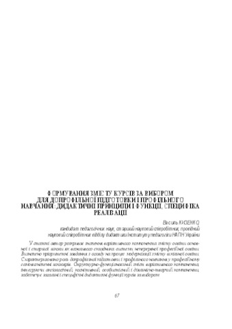 - Кизенко, Василь Іванович (2017) Forming of elective courses content for pre-profile and profile training: prin¬ciples and functions of didactics, specific of realization Дидактика: теорія і практика. pp. 67-76.