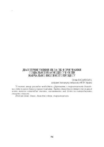 - Васьківська, Олена Євгеніївна (2017) Skills of dialogical communication as a means of social interaction of subjects of educational process Дидактика: теорія і практика. pp. 94-99.