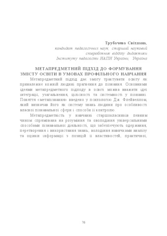 - Трубачева, Світлана Едуардівна (2017) Metapragmatic approach to the formation of education content in conditions of profile training Folia Comeniana: Вісник Польсько-української науково-дослідницької лабораторії психодидактики імені Я. А. Коменського.