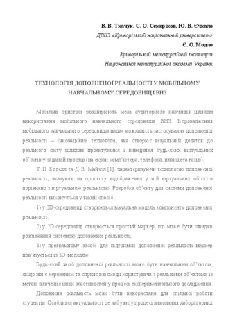 - Ткачук, В. В. (orcid.org/0000-0002-5879-5147), Семеріков, С.О. (orcid.org/0000-0003-0789-0272), Єчкало, Ю.В. and Модло, Євгеній Олександрович (orcid.org/0000-0003-2037-1557) (2017) The technology of augmented reality in mobile learning environment of university In: Засоби і технології сучасного навчального середовища: матеріали міжнародної науково-практичної конференції, м. Кропивницький, 19-20 травня 2017 року . Ексклюзив-Систем, м. Кропивницький, Україна, pp. 39-41.