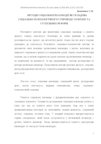 - Іванченко, С.М. (orcid.org/0000-0002-1434-5048) (2016) Methods of social interaction as a component of social psychological support for educational and social reforms Проблеми політичної психології, 3 (17). pp. 161-170. ISSN 2411-1449