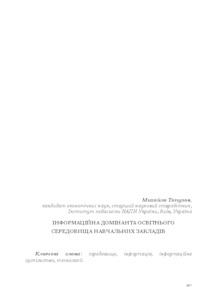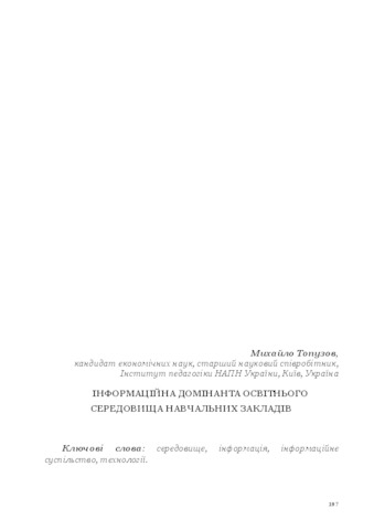 - Топузов, Михайло Олегович (orcid.org/0000-0001-7890-5959) (2017) Informative dominant of educational environment of educational establishments In: Україна – ЄС: крос-культурні порівняння в освітніх дослідженнях: Матеріали І міжнародної конференції, 22-23 травня 2017 р., м. Київ . Трек-ЛТД, м. Київ - м. Дрогобич, Україна, pp. 199-204. ISBN 978-617-7263-47-9