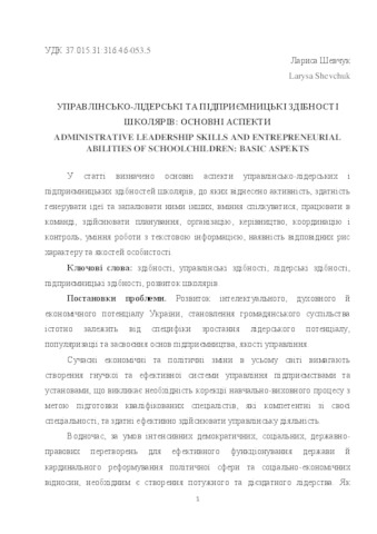 - Шевчук, Л.М. (2017) Administrative leadership skills and entrepreneurial abilities of schoolchildren basic aspekts Педагогічна освіта: теорія і практика, 1 (22) (1-2017). pp. 258-263. ISSN 2309-9763