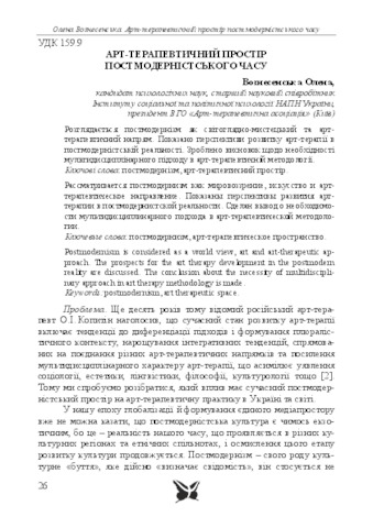 - Вознесенська, Олена Леонідівна (orcid.org/0000-0002-1273-0049) (2013) Art therapeutic space in post-modern time Простір арт-терапії, 1 (13). pp. 26-37.