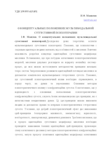 - Манілов, І.Ф. (2017) On conceptual theoretical basics of multimodal suggestive psychotherapy Проблеми сучасної психології: Збірник наукових праць Кам'янець-Подільського національного університету імені Івана Огієнка, 36. pp. 197-207. ISSN 2227-6246
